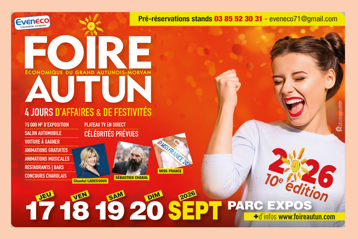 Foire économique d’Autun 2026 Foire économique d’Autun 2026 29 septembre 2025 romainlaborde Foire Economique d’Autun 2026 Du 17 au 20 septembre 2026 03 85 52 05 05 www.foireautun.com www.facebook.com/foireeconomique.autun/ Catégories:Mouv' Grand Autunois, Mouv’ Grand Autunois – Edition 57 Balises:Foire économique d'Autun 6 J'aime cet article !